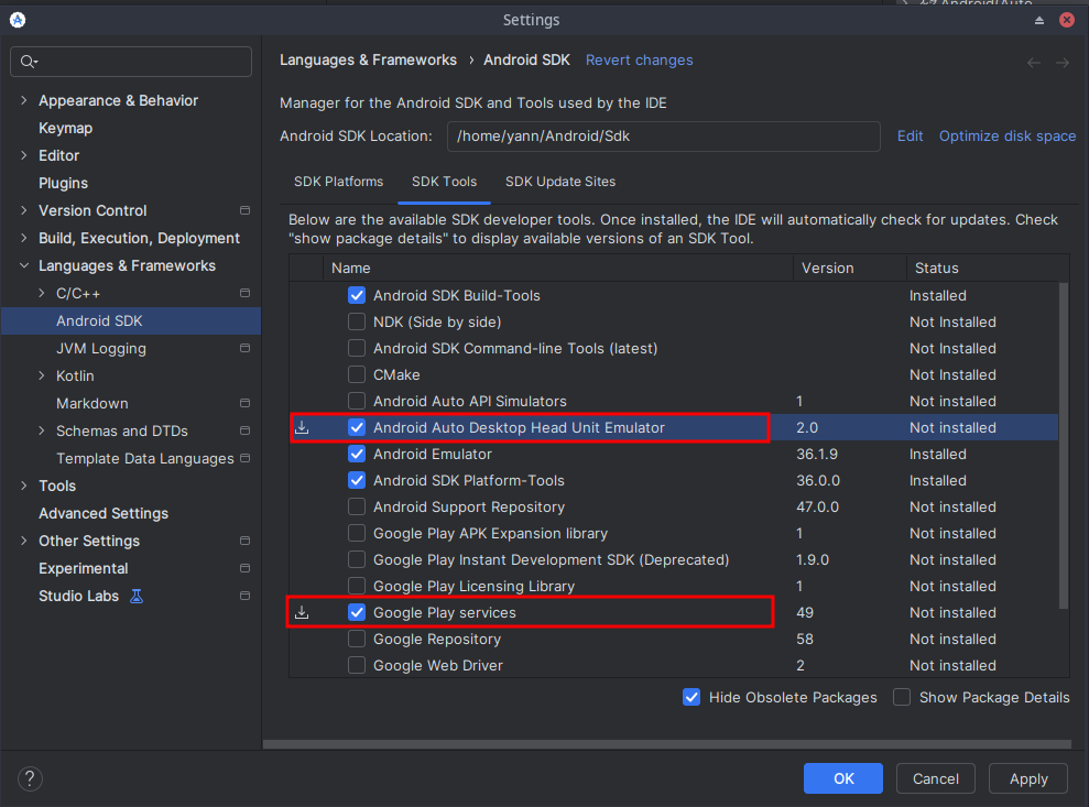 - Dans Android Studio, ouvrez SDK Manager et accédez à l’onglet SDK Tools, puis téléchargez le package Android Auto Desktop Head Unit Emulator.