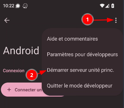 # 2 Mobile, ouvrir le menu à développer "android auto" dans paramètres, puis sélectionnez "Démarrer serveur unité principale"
