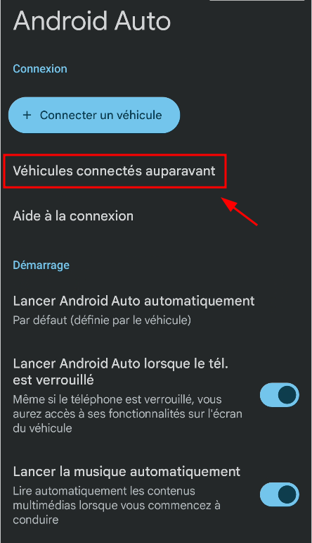 Paramètres > Applications > Android Auto > Paramètres supplémentaires dans l’application, appuyez sur Véhiculess connectées auparavant