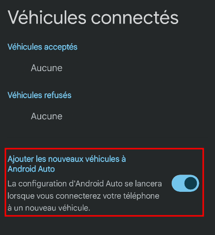 puis assurez-vous que l’option Ajouter les nouveaux véhicules à Android Auto est activée.