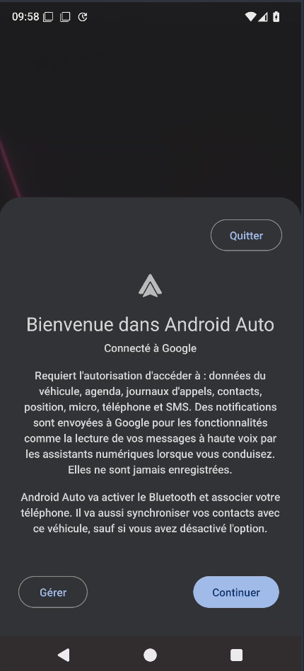 Si vous connectez l’appareil mobile à la DHU pour la première fois, consultez l’écran de l’appareil mobile pour accepter les conditions d’utilisation et ajuster les paramètres d’autorisation si nécessaire.