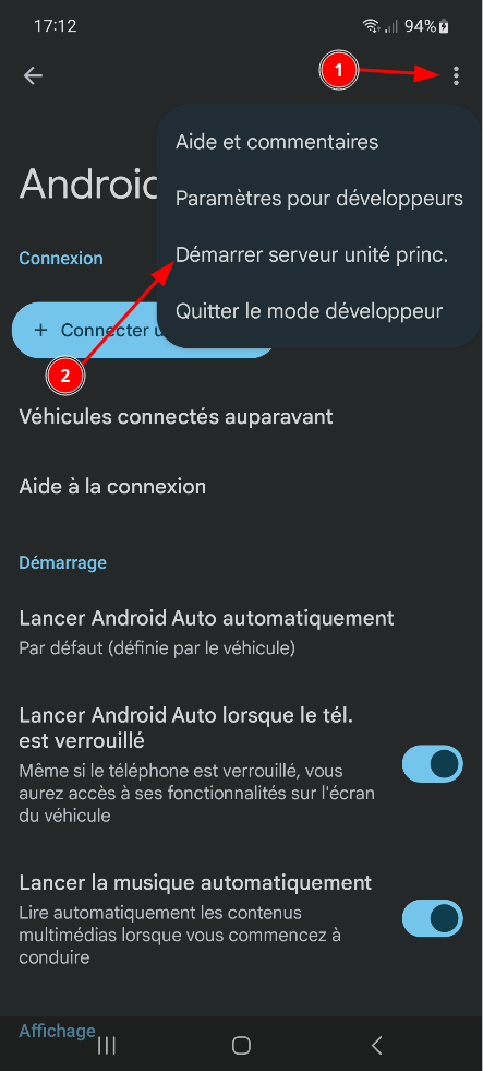 # 2 Mobile, ouvrir le menu à développer "android auto" dans paramètres, puis sélectionnez "Démarrer serveur unité principale"