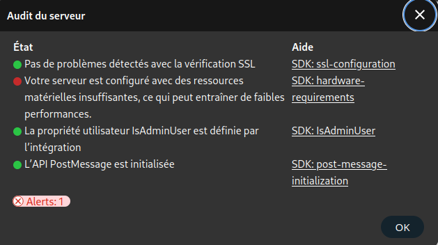 <disable_server_audit default="false" desc="Disabled server audit dialog and notification. Admin will no longer see warnings in the application user interface. This doesn't affect log file." type="bool">true</disable_server_audit>