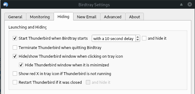 Il convient également de noter que par défaut, Birdtray n’est pas configuré pour démarrer automatiquement Thunderbird au démarrage de Birdtray, pour masquer / afficher la fenêtre Thunderbird lorsque vous cliquez sur l’icône de la barre d’état, masquer la fenêtre Thunderbird lorsqu’elle est minimisée, etc. Vous pouvez activer toutes ces options dans les paramètres Birdtray, sous l’onglet Hiding .