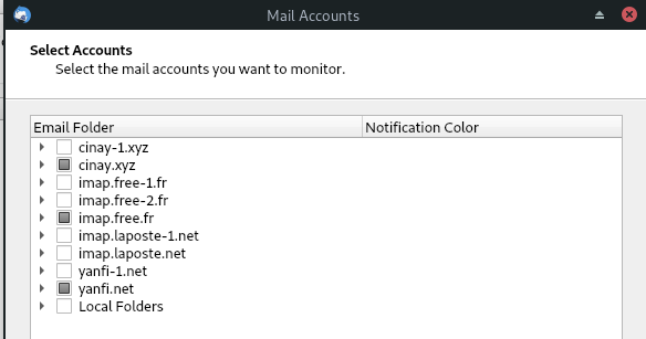 - Comptes configurables / dossier de messagerie pour lequel il doit vérifier les nouveaux e-mails