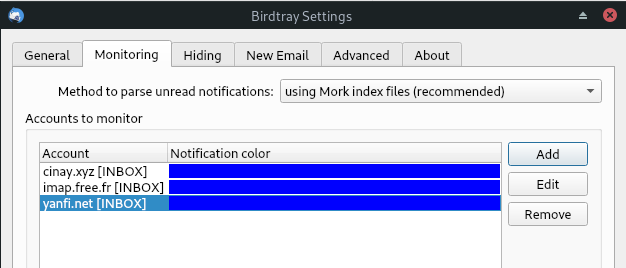 Avec Birdtray 1.7.0 et plus récent, vos comptes de messagerie de votre profil ~/.thunderbird devraient être répertoriés, vous permettant de sélectionner ceux pour lesquels vous souhaitez être averti:
