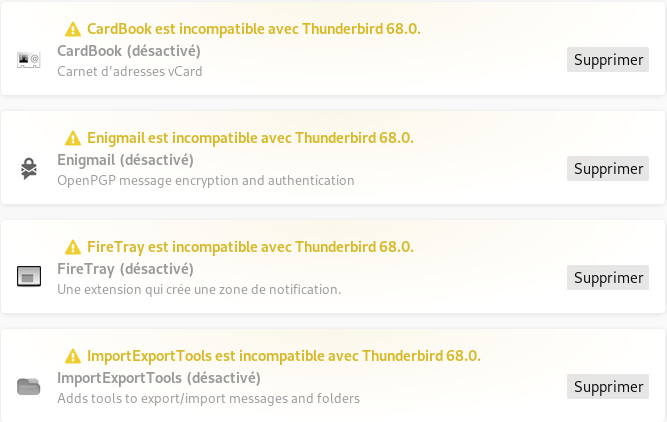 A partir de la version 68, de nombreux modules ne sont plus valides notamment cardbook et firetray.
