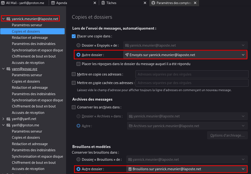 Je demande à Thunderbird d’envoyer une copie des mails sortants dans le dossier adéquat, idem pour les brouillons.