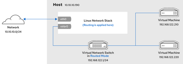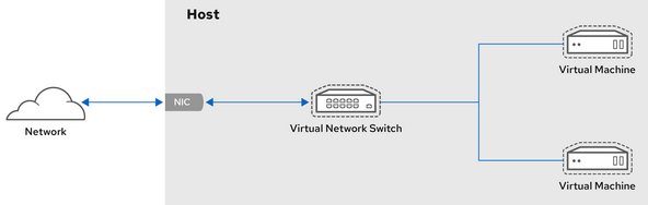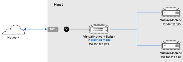 En mode isolé, les machines virtuelles connectées au commutateur virtuel peuvent communiquer entre elles et avec la machine hôte, mais leur trafic ne passe pas en dehors de la machine hôte et elles ne peuvent pas recevoir de trafic en provenance de l’extérieur de la machine hôte. L’utilisation de dnsmasq dans ce mode est nécessaire pour les fonctionnalités de base telles que DHCP.