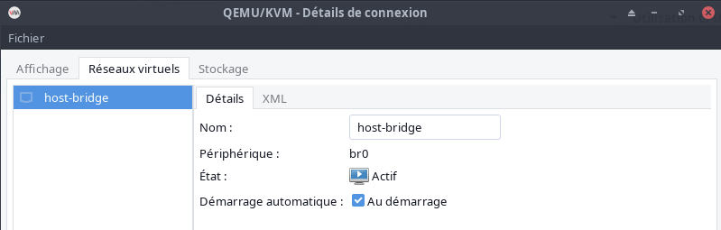 sudo virsh net-autostart host-bridge # -> Réseau host-bridge marqué en démarrage automatique