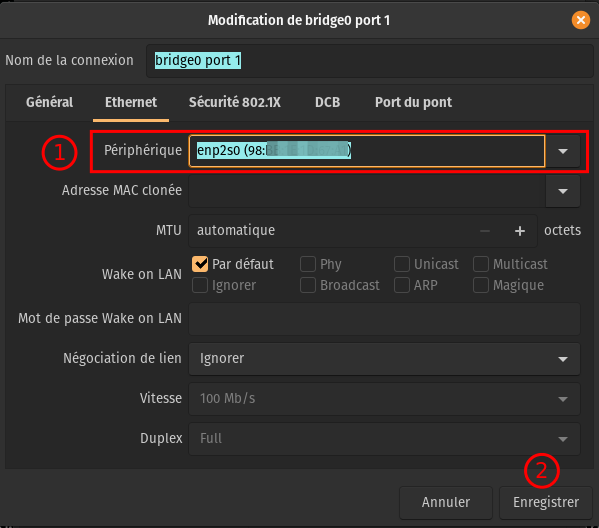 Sélectionner l’interface réseau à lié au pont (enp3s0f0) :