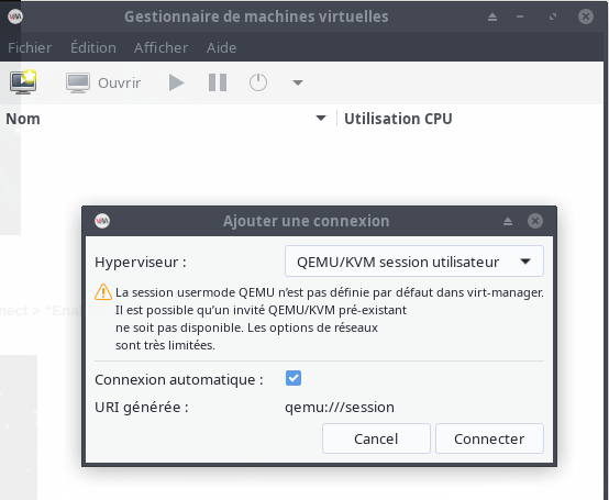Ajoutez votre compte utilisateur au groupe libvirt.