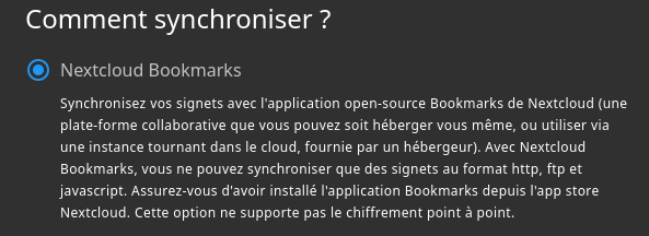 ☸ Synchronisez via Nextcloud Bookmarks, Google Drive ou un service compatible WebDAV
