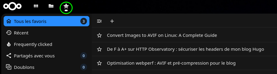 Une fois la synchronisation réussie, vos favoris seront visibles dans l’application Favoris sur votre instance Nextcloud :