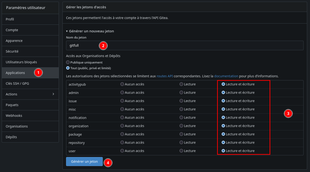 Créer des jetons d’accès pour pousser des paquets vers Gitea