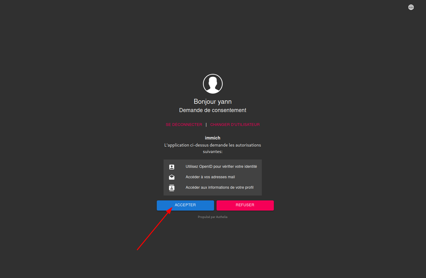 Les applications web et mobile d’Immich afficheront un nouveau bouton pour se connecter via OAuth/OIDC. Cliquez simplement sur ce bouton, authentifiez-vous sur Authelia et vous serez redirigé vers Immich en tant qu’utilisateur authentifié.