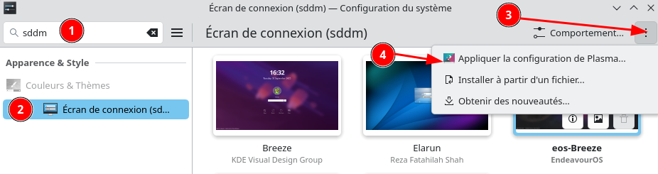 Les modifications apportées à votre configuration d’affichage dans une session Plasma Wayland (par exemple, mise en page du moniteur, résolution, etc.) ne persisteront pas vers SDDM. Pour les faire persister, ouvrez les paramètres du système de Plasma et accédez à Couleurs et thèmes > Écran de connexion (SDDM) et cliquez sur “Appliquer les paramètres de plasma…”. Vous devrez avoir la permission d’effectuer cette action.