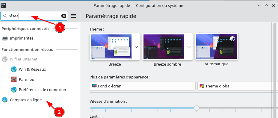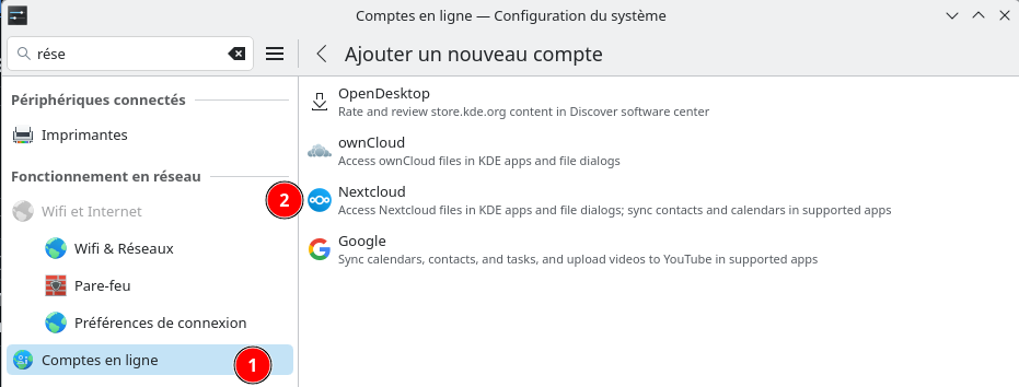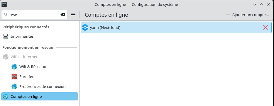 Comptes en ligne est un endroit central pour ajouter, supprimer et configurer des comptes pour divers services en ligne tels que Nextcloud, Google et autres. L’ajout d’un nouveau compte en ligne permet à n’importe quelle application KDE d’interagir avec le service - par exemple, l’ajout d’un nouveau compte Google vous permet d’accéder automatiquement aux fichiers Google Drive de Dolphin.