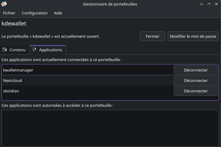 Ouvrez KDE Wallet Manager et allez dans Paramètres -> Configurer le portefeuille… -> Contrôle d’accès, puis ajustez les paramètres de l’application. Utile si vous avez demandé par erreur à une application de ne pas utiliser KDE Wallet Manager.