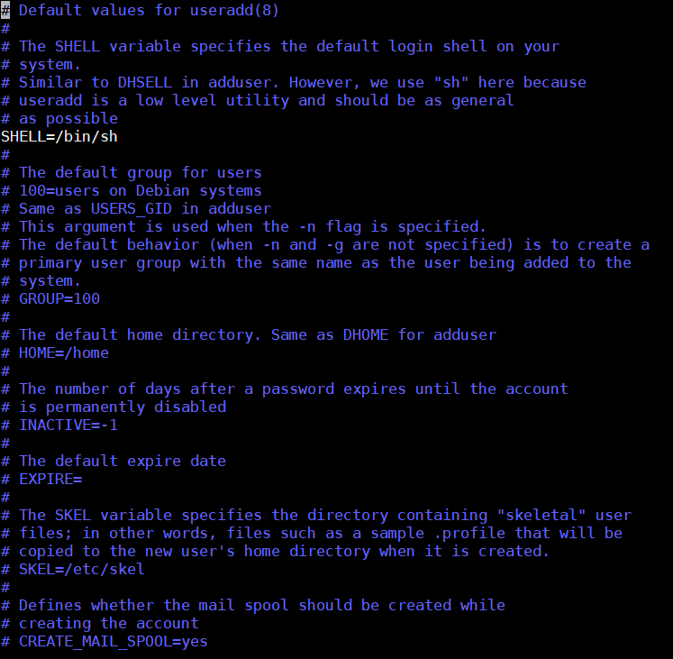 Dans ce fichier, vous pouvez modifier les paramètres par défaut pour les utilisateurs créés avec useradd, tels que le shell et le répertoire de base.