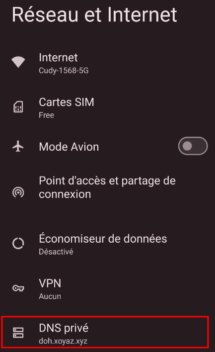 - Paramètres → Réseau et Internet → Avancé → DNS privé