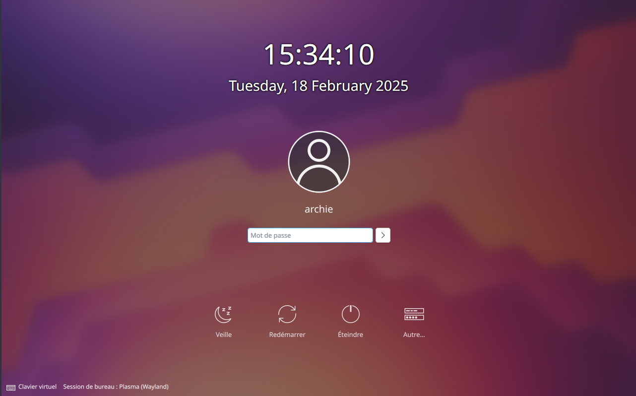 Sélectionnez et connectez-vous à la session Wayland de KDE Plasma dans Arch Linux.