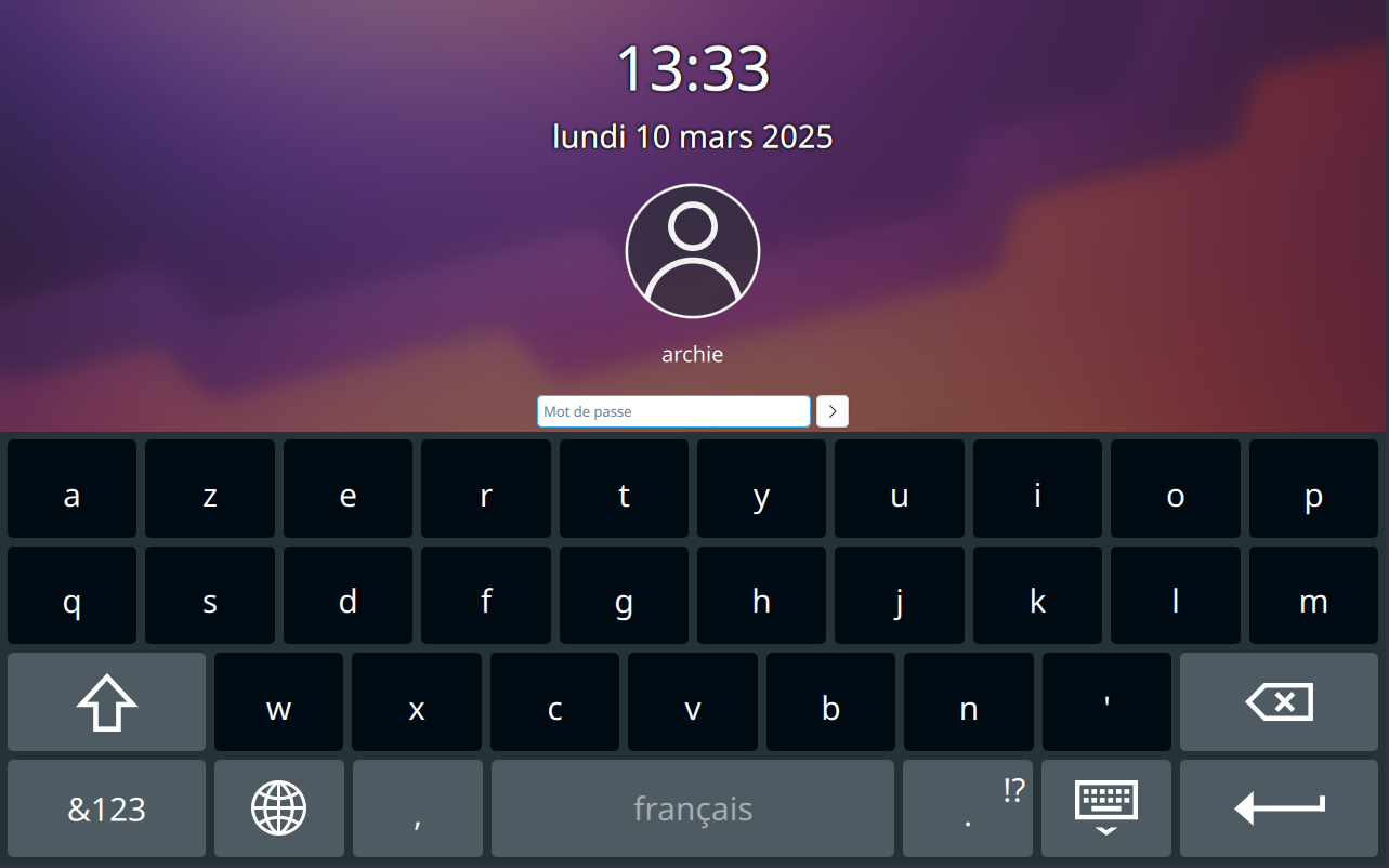 Installez qt5-virtualkeyboard : yay -S qt6-virtualkeyboard