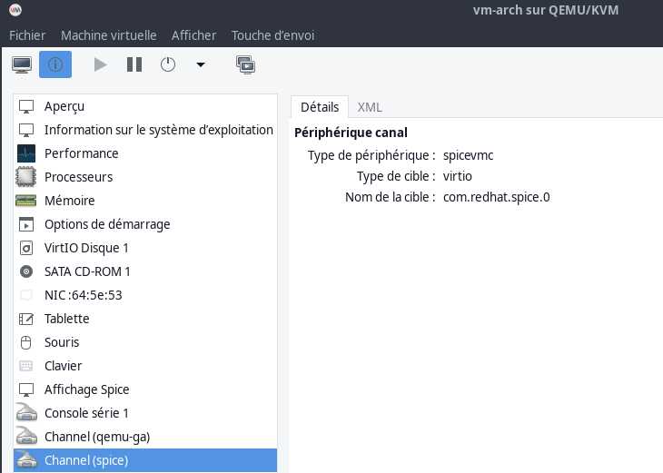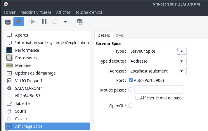 - Modifier Affichage, passer de Serveur VNC à Serveur Spice
