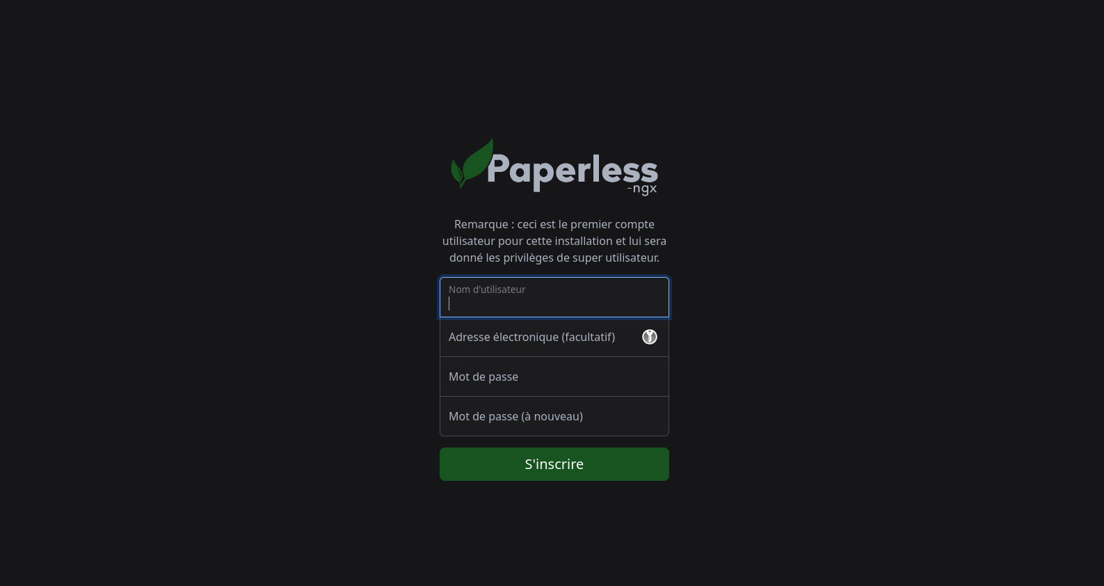 Lors de votre premier accès à l’interface web Paperless-ngx, vous serez invité à créer un compte administrateur.