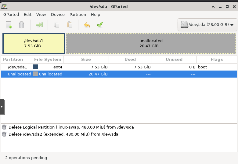 Vous verrez votre disque /dev/sda1 de 7.53 Go, une partition étendue /dev/sda2 qui contient /dev/sda5 pour le swap, et un espace non alloué de 20 Go.