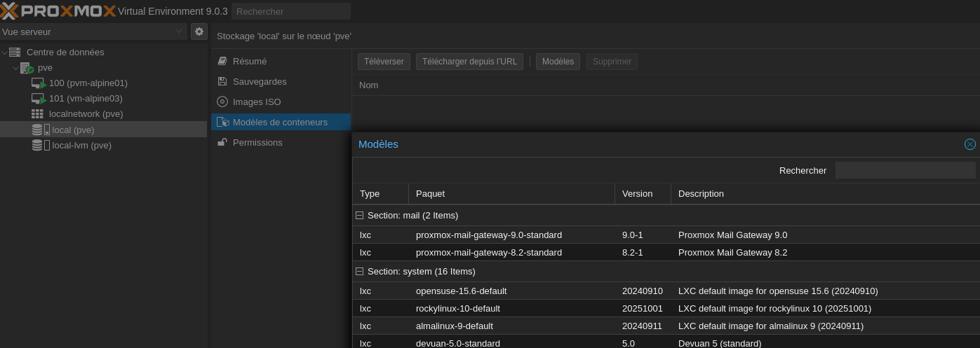 ➡️ Puis cliquez sur “local” (ou autre stockage) > “Modèles de conteneurs”