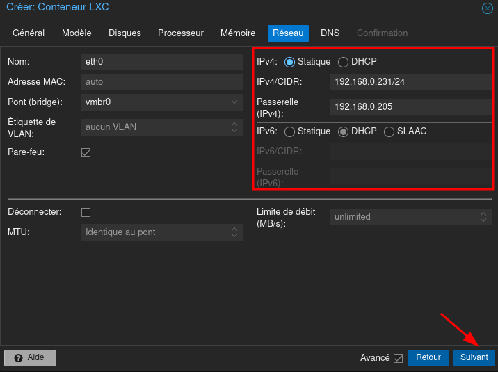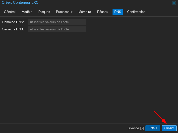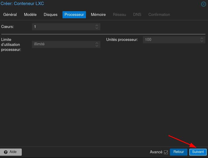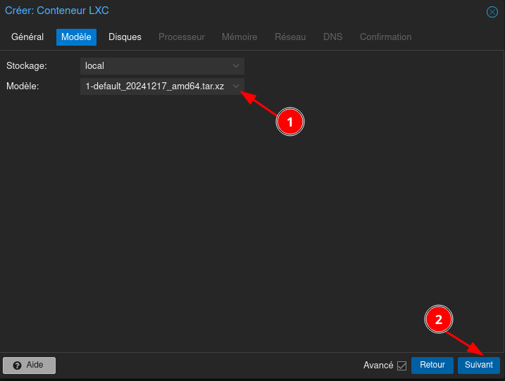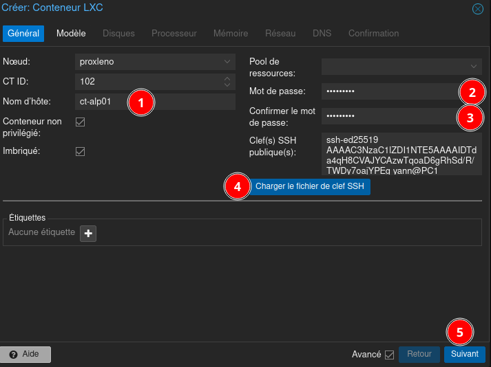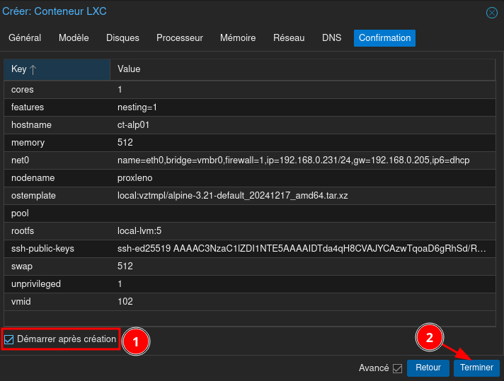 Conteneur non privilégié : cette option permet de choisir au moment de la création si vous voulez créer un conteneur privilégié ou non privilégié.