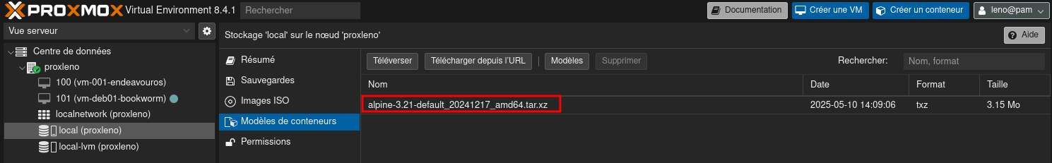 Proxmox VE lui-même fournit une variété de modèles de base pour les distributions Linux les plus courantes. Ils peuvent être téléchargés en utilisant l’utilitaire de ligne de commande GUI ou pveam (short for Proxmox VE Appliance Manager). En outre, les modèles de conteneur TurnKey Linux sont également disponibles à télécharger.