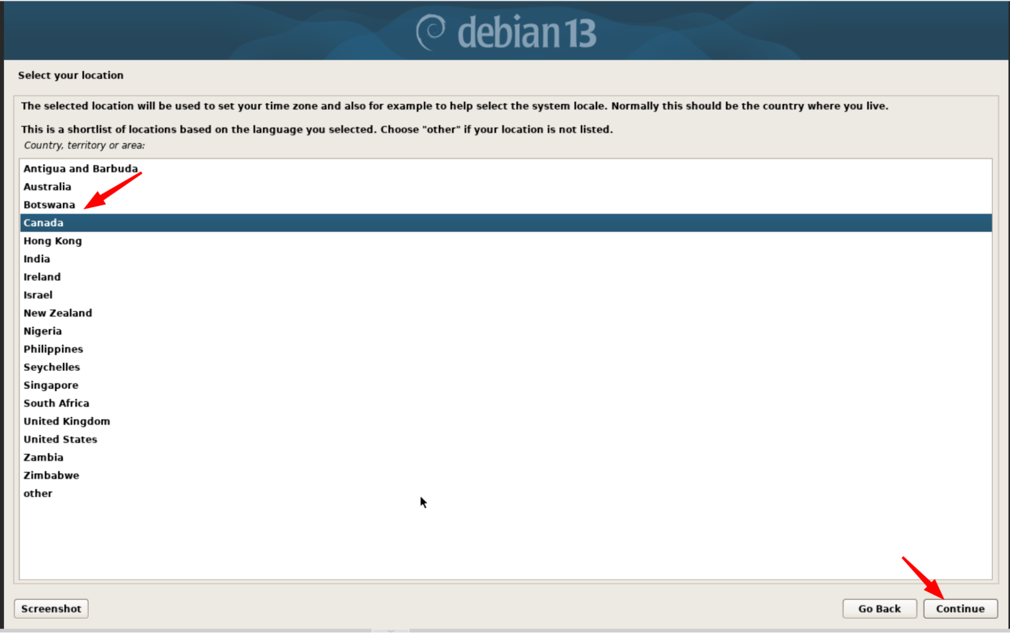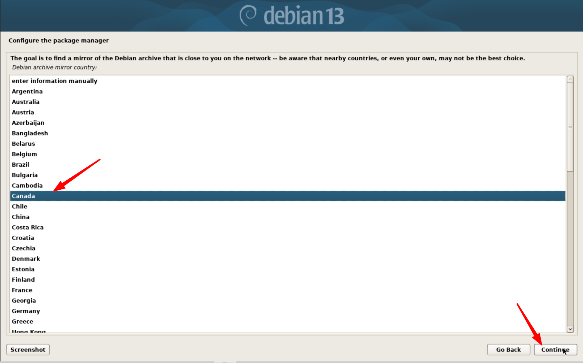 Sélectionnez le pays le plus proche de vous pour que l’installation télécharge les paquets depuis un miroir rapide. Pas besoin de trop réfléchir ici : même si vous choisissez un pays voisin, l’installateur détectera automatiquement le miroir le plus efficace.