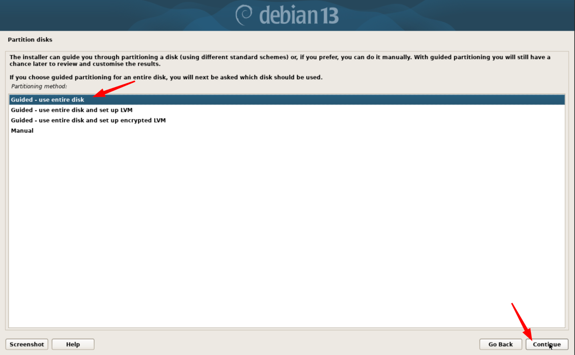 Guided – use entire disk and set up encrypted LVM : même chose, mais avec chiffrement du disque pour plus de sécurité.