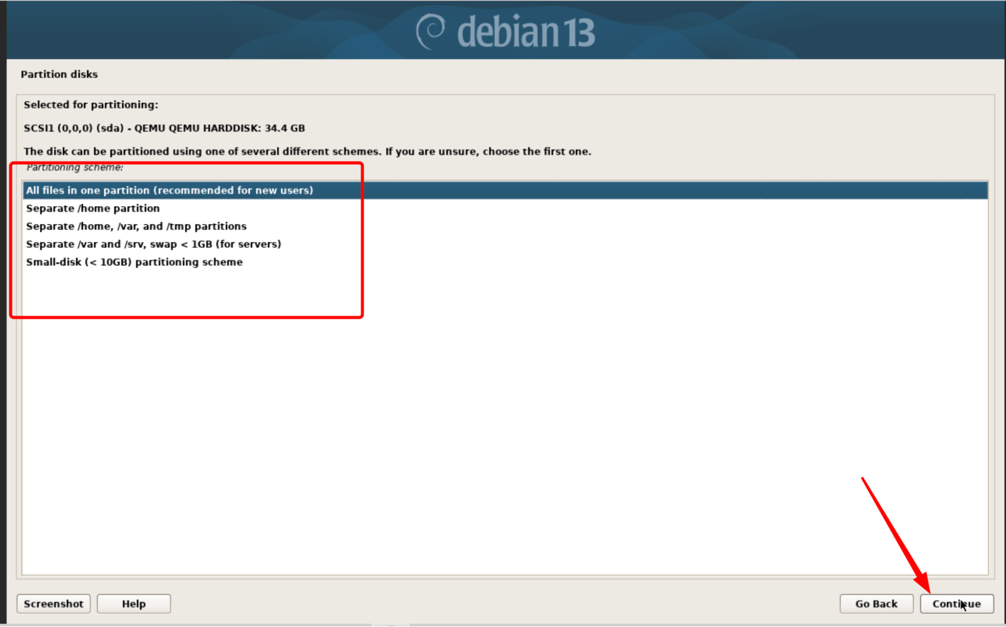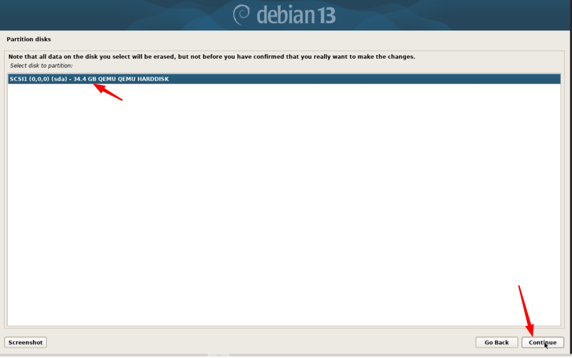 Vérifiez bien que vous sélectionnez le bon disque (utile surtout si vous avez plusieurs disques dans la VM ou un environnement multi-boot), puis cliquez sur Continue.