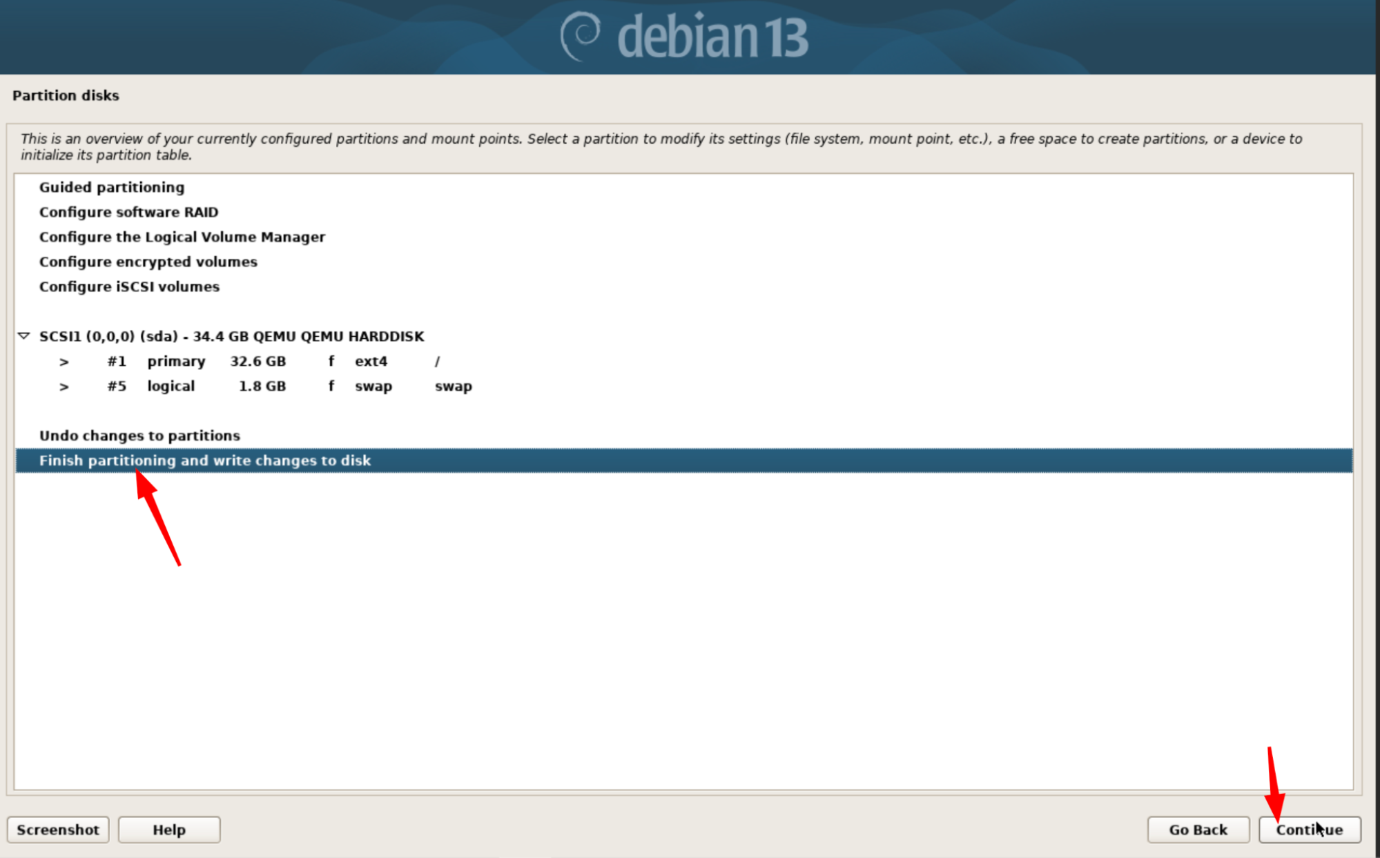 partitioning and write changes to disk, puis cliquez sur