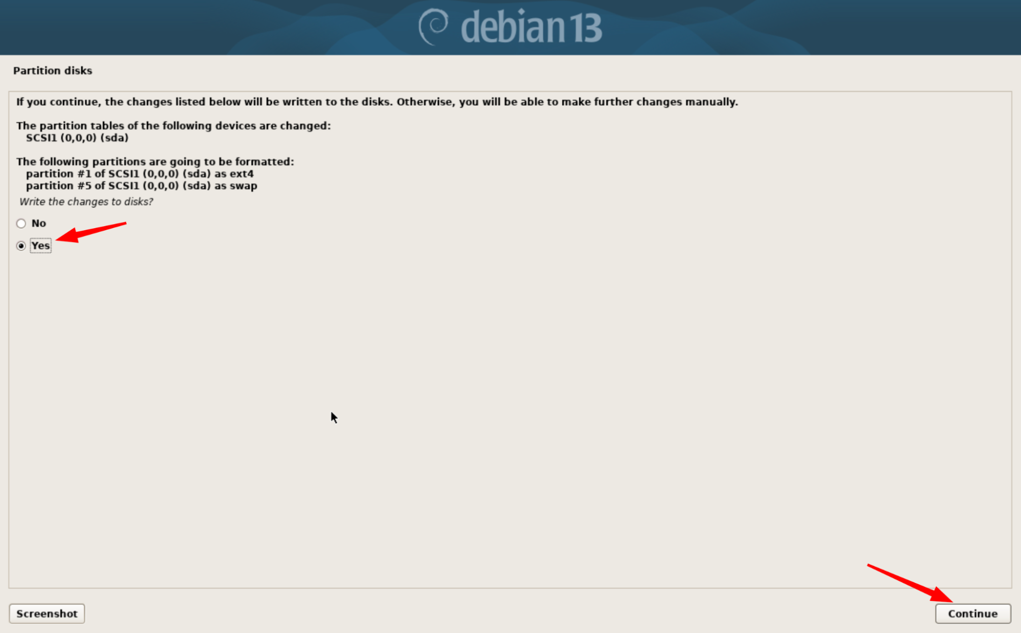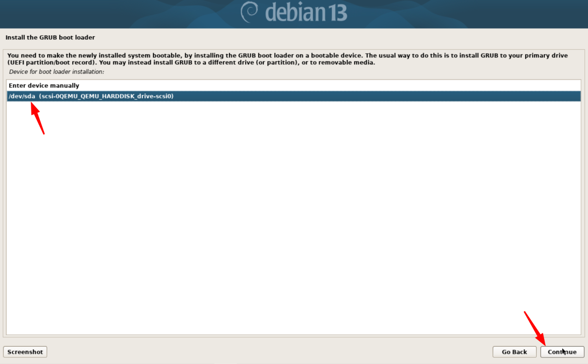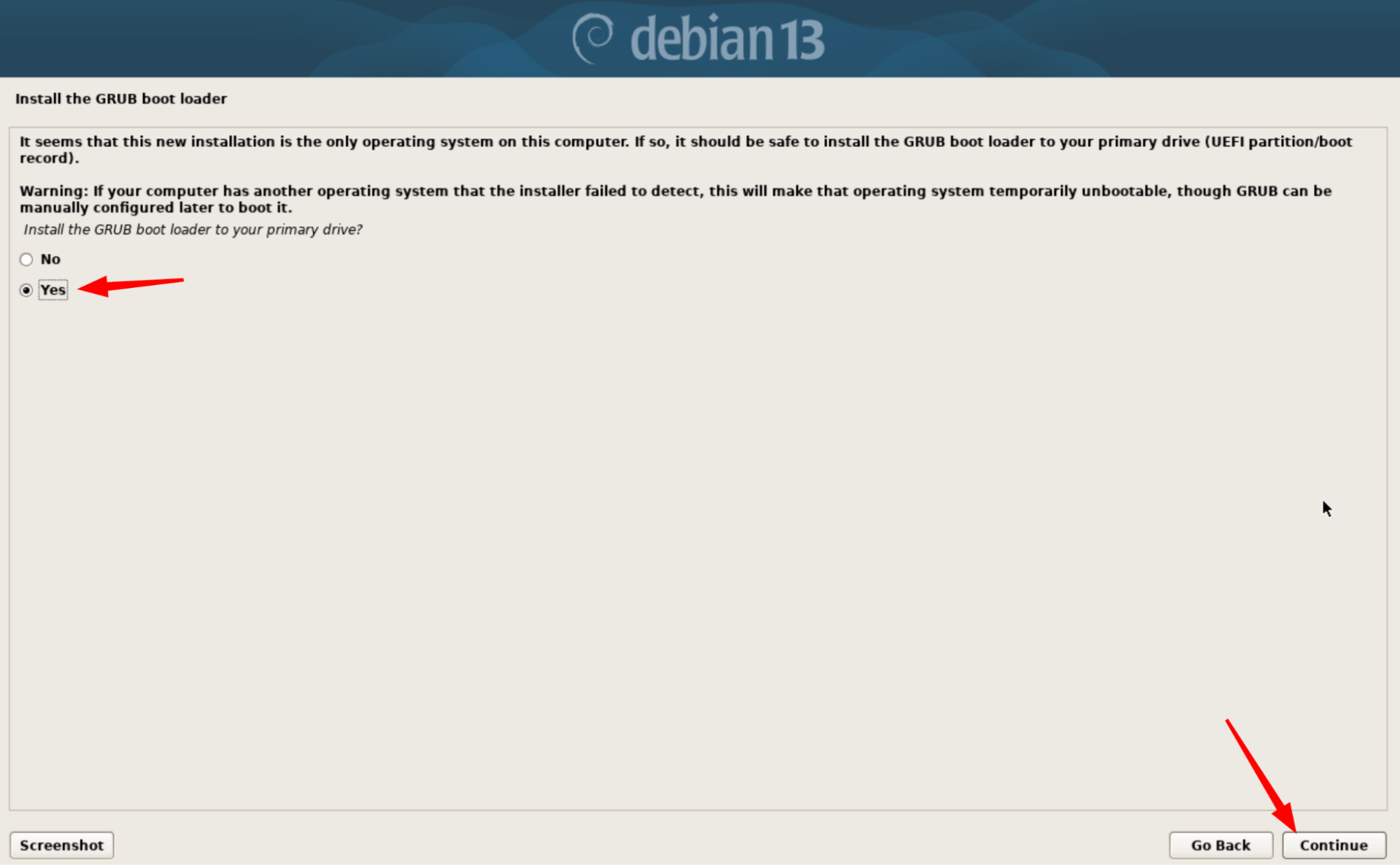 Sélectionnez Yes pour installer GRUB, puis cliquez sur Continue.