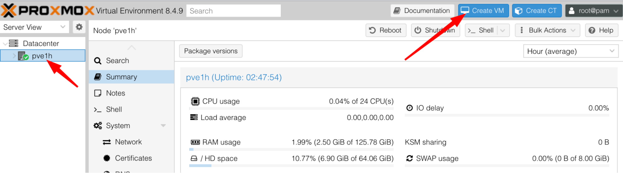 Proxmox, cliquez sur le bouton Create VM
