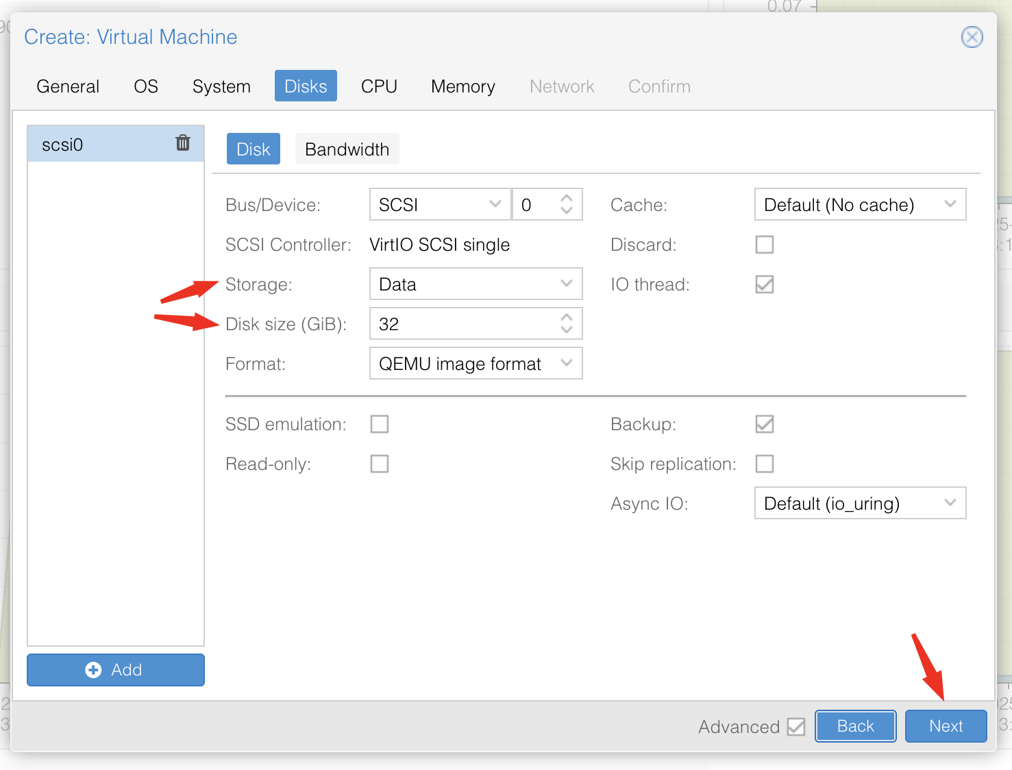 SCSI Controller : on garde celui déjà choisi, VirtIO SCSI single, c’est rapide et efficace.
