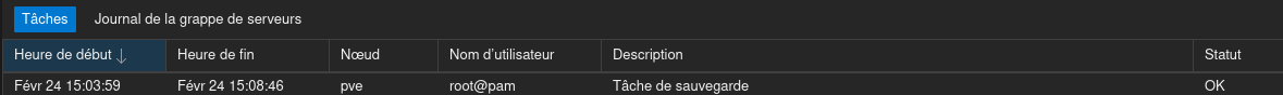 Et voilà votre job de sauvegardes configuré. Maintenant, chaque jour à 00h20 les machines virtuelles et conteneurs, en résumé l’intégralité du système va être sauvegardé.