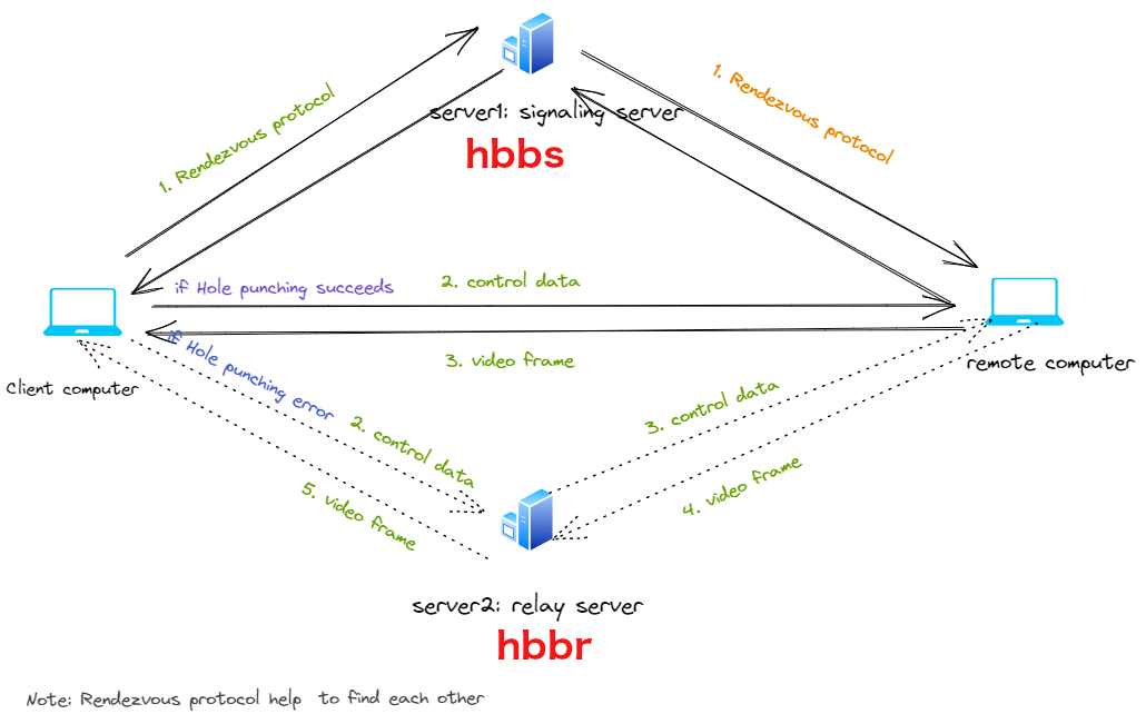 D’un point de vue réseau, la connexion n’est pas directe de “A” vers “B”. Elle passe par un ordinateur tiers qui héberge Rustdesk. On appelle cet ordinateur intermédiaire : un relais.
