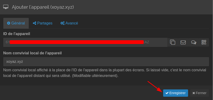 - ID du partage Identifiant unique du partage. Doit être le même sur l’ensemble des appareils concernés. N’hésitez pas à remplacer celui proposé d’office par Syncthing par un nom intelligible.