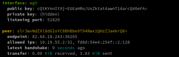 Notez à nouveau l’interface wg0 et l’adresse IPv6 fddb:a8d3:7f3a::2 que vous avez attribuée au client PEER