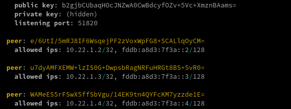 Si vous définissez les adresses IP autorisées client PEER sur 0.0.0.0/0 et ::/0 (ou si vous utilisez d’autres plages que celles que vous avez choisies pour le VPN), votre résultat ressemblera à ce qui suit
