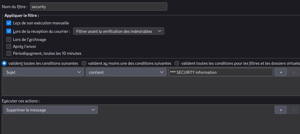 Règle de messagerie ouestyan.xyz thunderbird pour supprimer les message qui contiennent *** SECURITY information dans le sujet