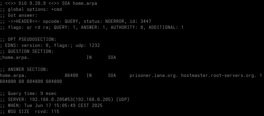 transparentdelocal-zonea le fonctionnement suivant : si le domaine est listé dans leslocal-data, Unbound répond avec ces données ouNODATAsi l’enregistrement demandé ne s’y trouve pas. Le mécanisme de résolution normal est utilisé si le domaine ne possède aucune donnée locale. Il est utilisé si on héberge une sonde RIPE Atlas, le résolveur peut-être utilisé pour des tests et notamment des requêtes demanant leSOAdehome.arpa. (qui est un enregisrement qui existe dans les véritablesNSdu domaine). Donc, pour essayer d’éviter de révéler que ce domaine est utilisé localement,transparentme semble une bonne solution. - Sans cette contrainte, le type