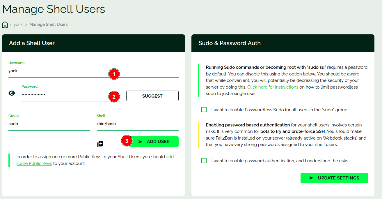 Utilisateur créé, il faut ajouter les clés en se connectant sur un terminal web